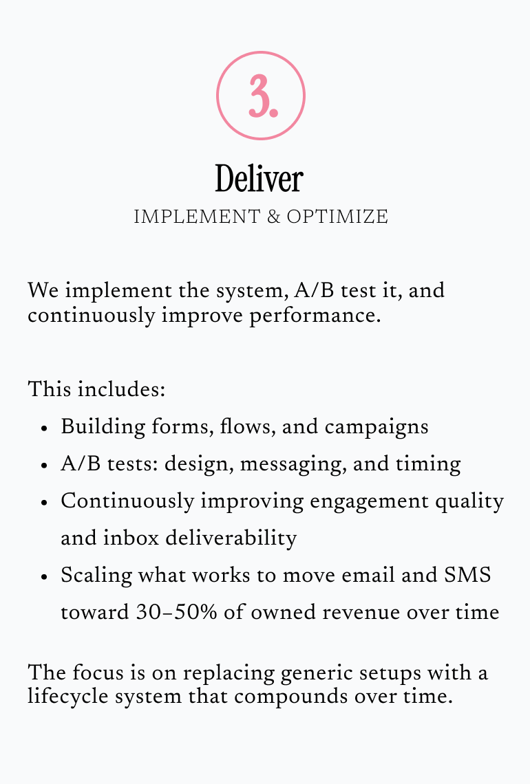 Once you’re live, we handle all ongoing management — keeping your deliverability clean, flows optimized, lists healthy, and every technical setting properly configured, so you can stay focused on running your business.